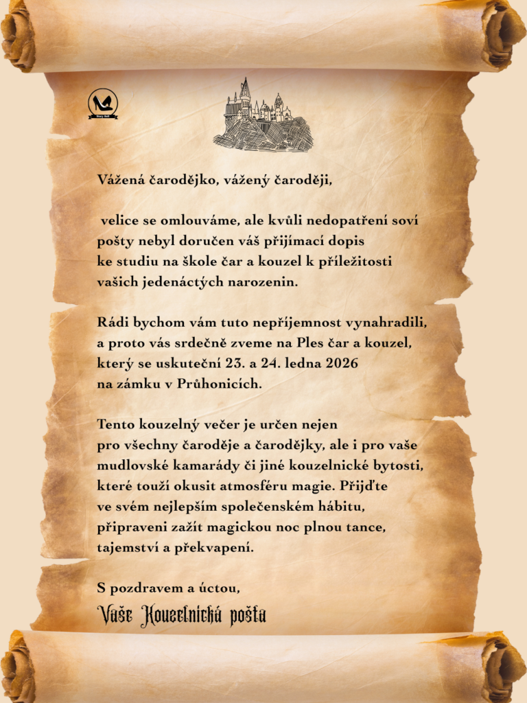 velice se omlouváme, ale kvůli nedopatření soví pošty nebyl doručen váš přijímací dopis ke studiu na škole čar a kouzel k příležitosti vašich jedenáctých narozenin.